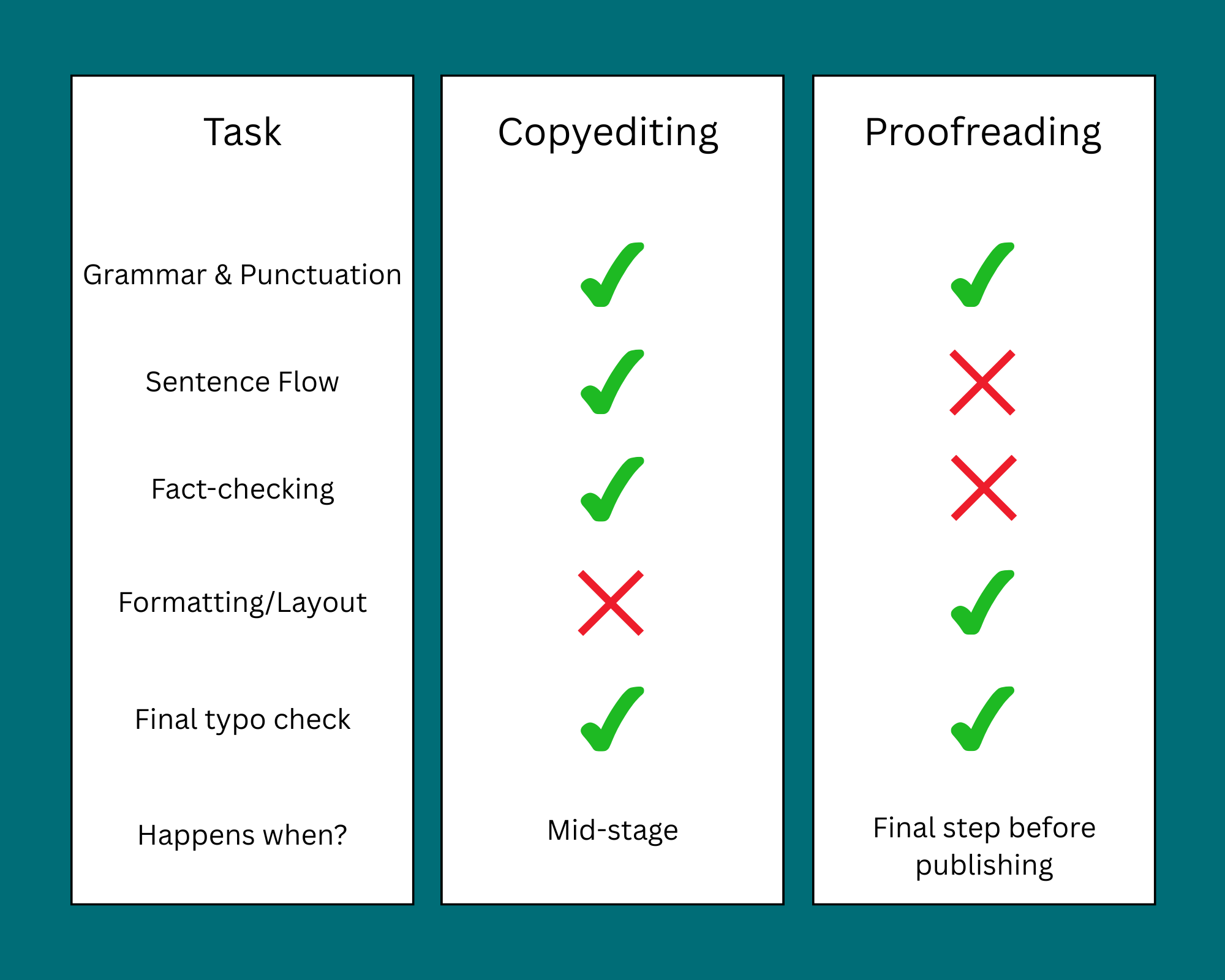 Both types of editing involve looking for errors and inconsistencies in grammar, spelling, punctuation, and capitalization. Copyediting also involves word usage and style. Proofreading is performed on a fully edited and formatted document prior to publication and also examines layout.